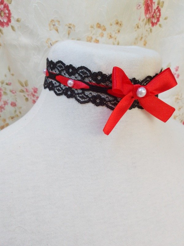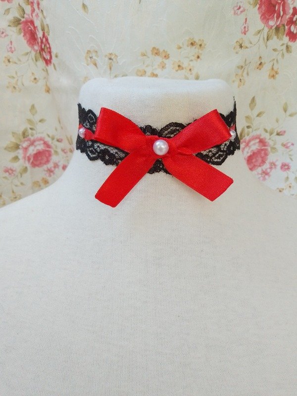 Choker de puntilla con cinta bebe entrelazado decorado con moño de cinta de raso y perlas.