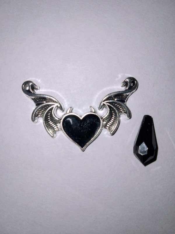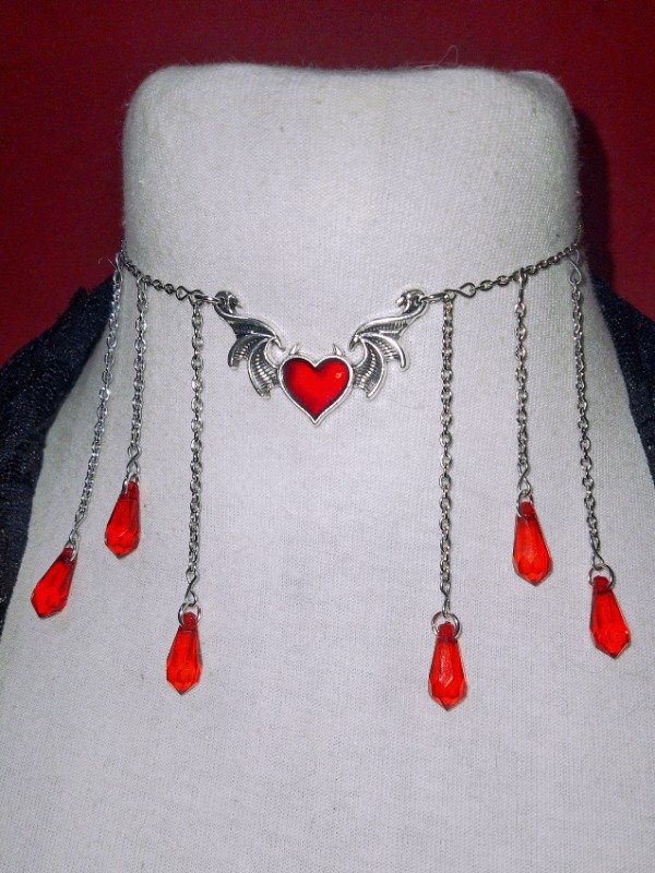 Éste choker está compuesto por una cadena metálica plateada que ajusta cómodamente al cuello. En el centro del choker se encuentra un corazón rojo esmaltado como pieza central, enmarcado por alas metálicas. Desde la cadena principal, cuelgan seis cadenas más delgadas, también plateadas, dispuestas de manera simétrica. Cada una de estas cadenas termina con un colgante de acrílico rojo en forma de lágrima.