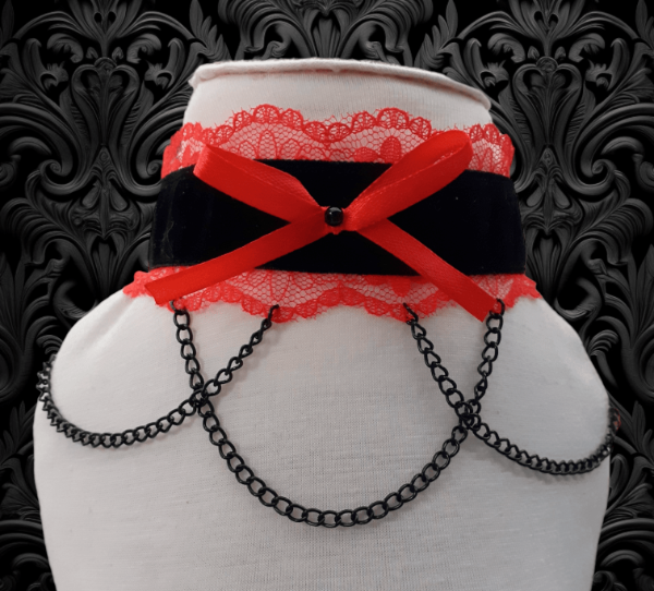 Colores y Materiales: Este accesorio está compuesto por encaje rojo, una cinta de terciopelo negra y una cinta de raso roja. La combinación de estos colores le da un aspecto audaz y vibrante.